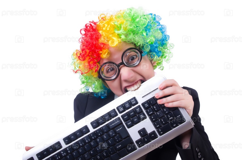 Забавный клоун с клавиатурой на белом фоне