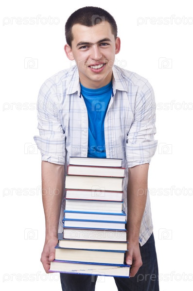 Студент с большим количеством книг на белом