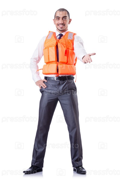 Мужчина в спасательном жилете, изолированный на белом