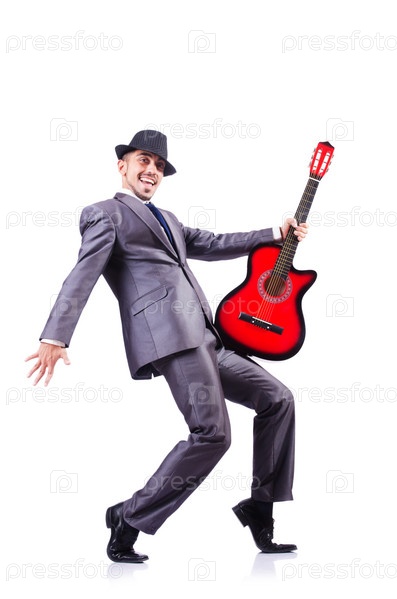 Бизнесмен с гитарой, изолированный на белом