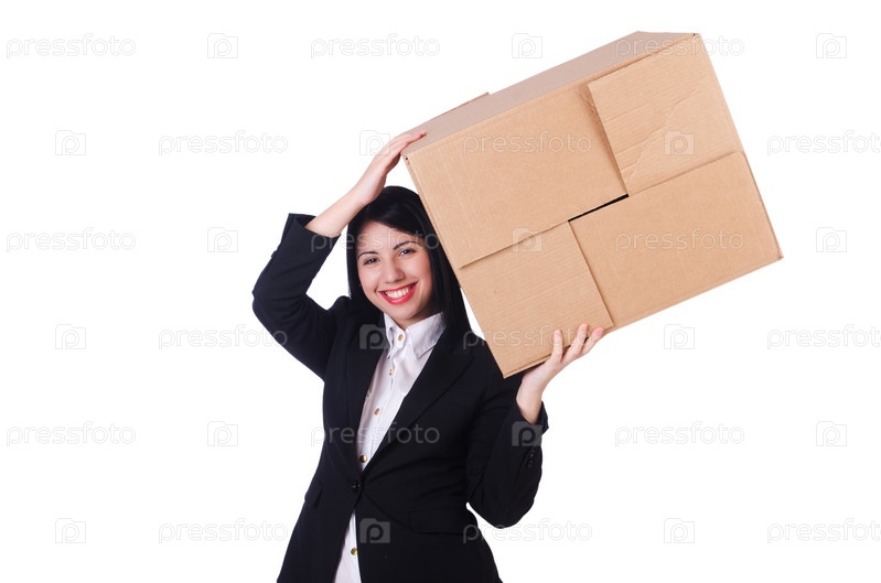 Женщина с большим количеством коробок на белом