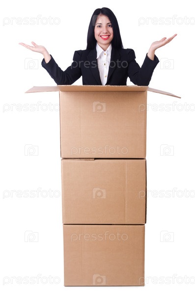 Женщина с большим количеством коробок на белом