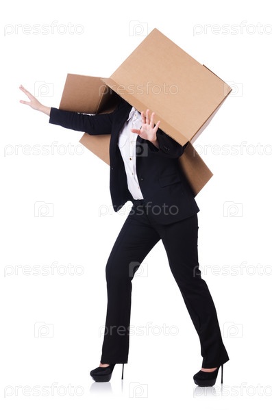 Женщина с большим количеством коробок на белом