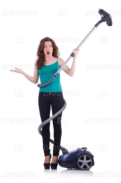 Молодая женщина с пылесосом на белом