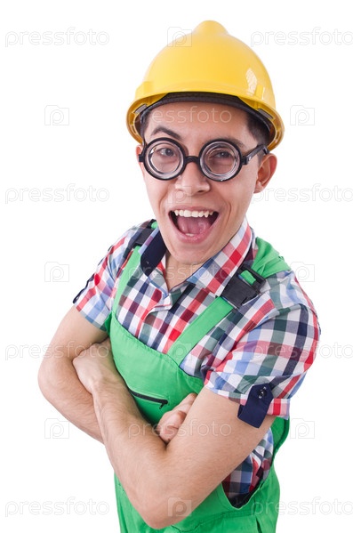 Смешной строитель, изолированный на белом фоне