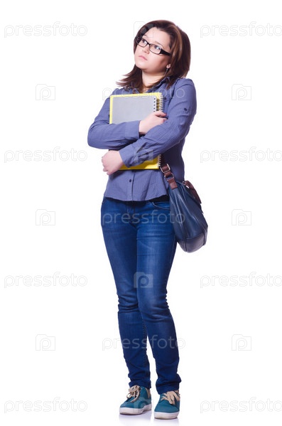 Студентка с книгами на белом фоне