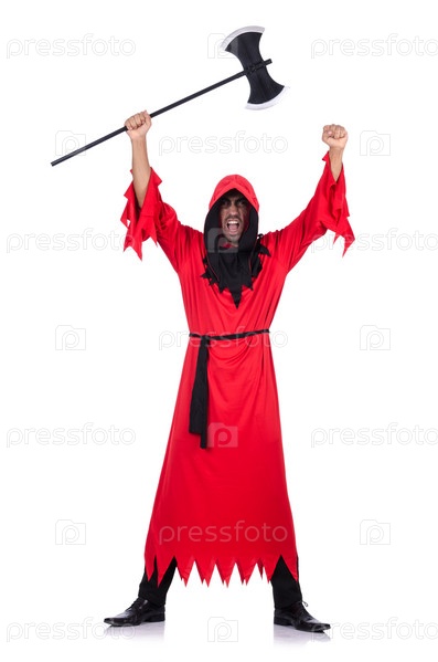 Палач в красном костюме с топором на белом фоне