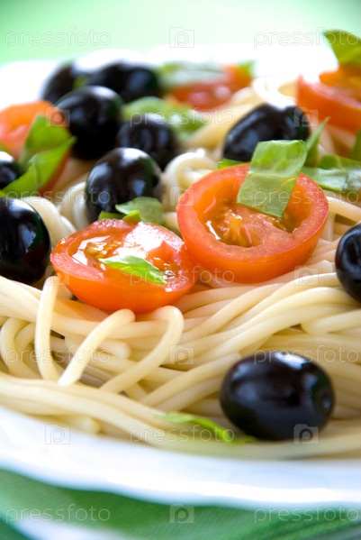 Спагетти с помидорами черри, маслинами и салатом