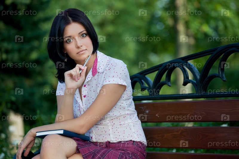 Девушка с блокнотом сидит на скамье в парке