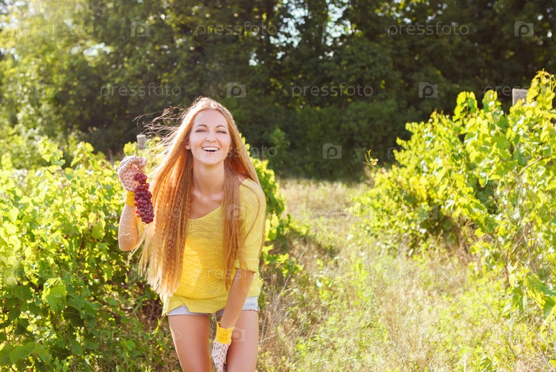 Женщина-виноградарь собирает виноград во время сбора урожая