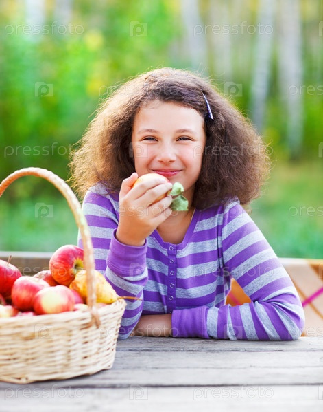 Улыбаясь девочка с корзиной красных яблок