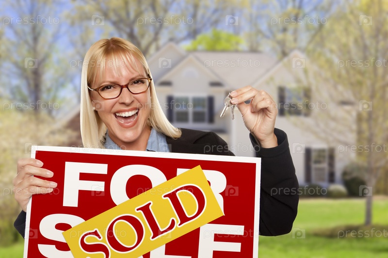 Женщина с ключами и знаком ПРОЛДАНО перед домом