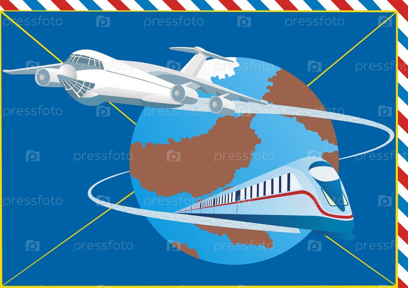 Почтовый конверт с Земным шаром, поездом и самолетом