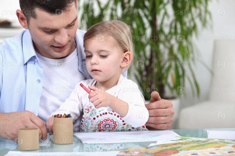 Отец и дочь рисуют карандашами