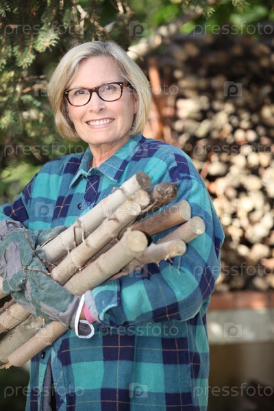 Женщина собирает дрова в лесу