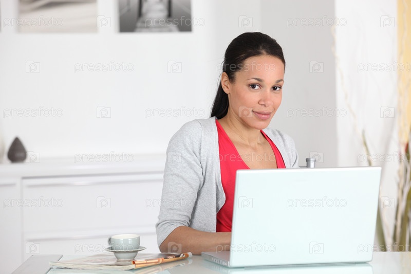Женщина сидит с чашкой кофе за ноутбуком