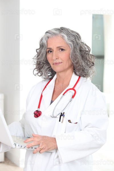 Женщина-врач держит ноутбук