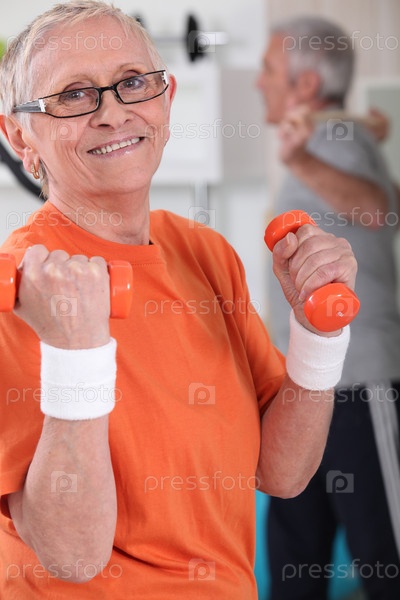 Счастливая пожилая женщина тренируется в тренажерном зале