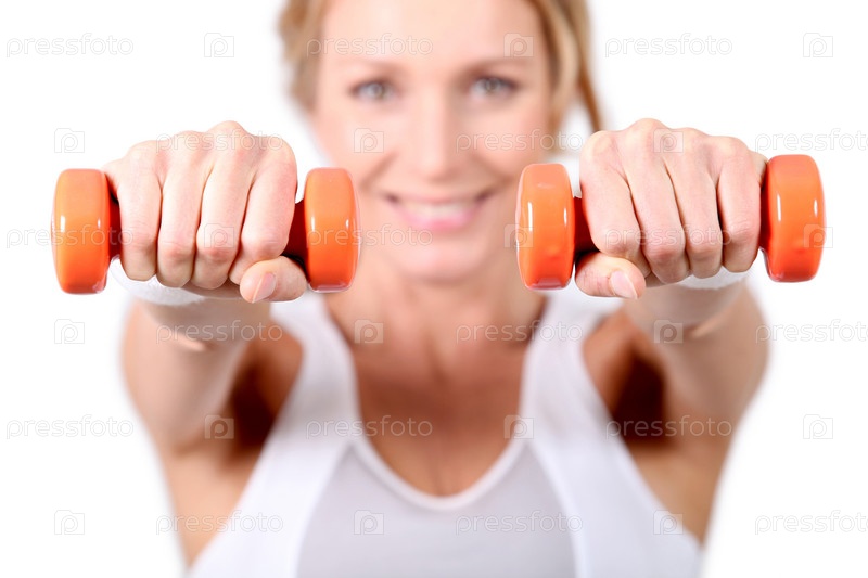 Женщина использует гантели во время тренировки