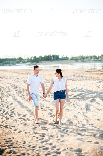 Влюбленная пара гуляет на берегу реки