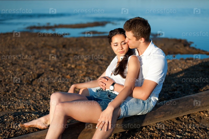 Влюбленная пара гуляет на берегу реки