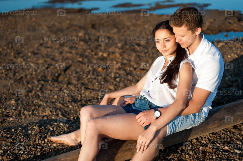 Влюбленная пара гуляет на берегу реки