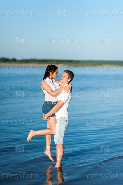 Влюбленная пара гуляет на берегу реки