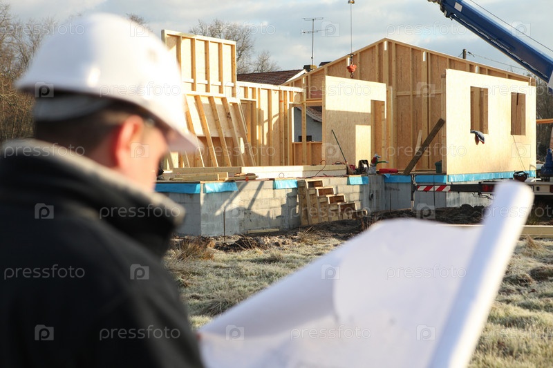 Прораб стоит спиной к камере, сверяясь с чертежами на строительной площадке