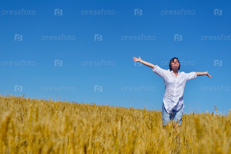 Молодая женщина с руками, поднятыми к небу