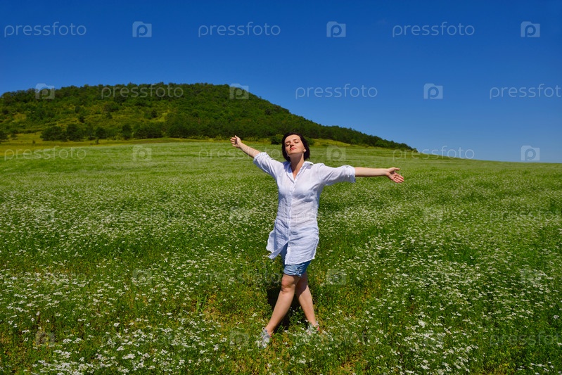 Молодая счастливая женщина на зеленом поле