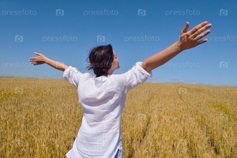 Молодая женщина с руками, поднятыми к небу