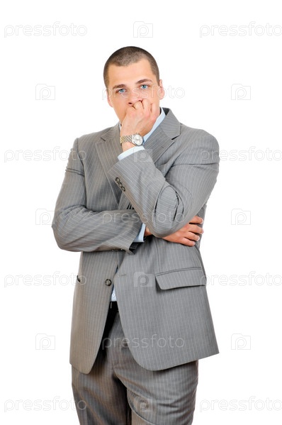 Задумчивый мужчина в сером костюме на белом фоне