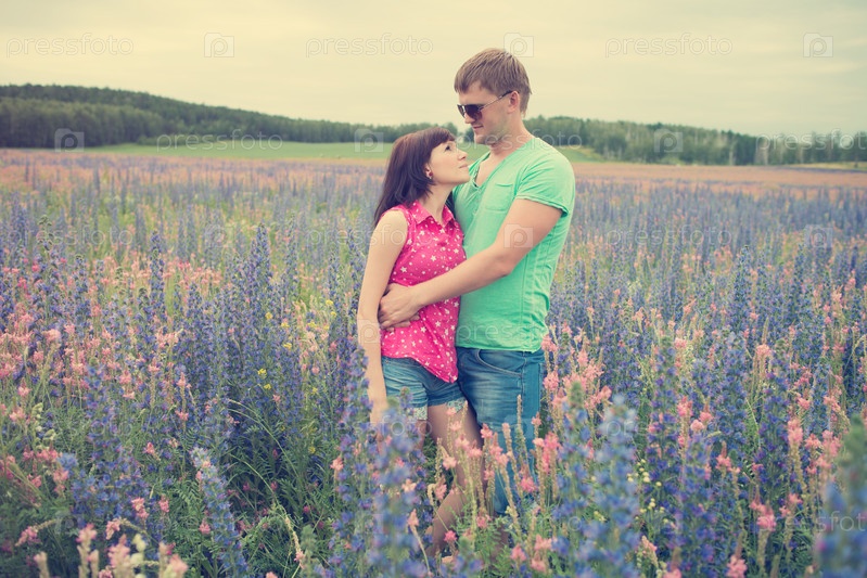 Молодая пара стоит в летнем поле, обнимаясь и глядя друг на друга