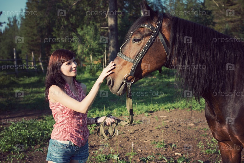 Молодая улыбающаяся женщина гладит лошадь