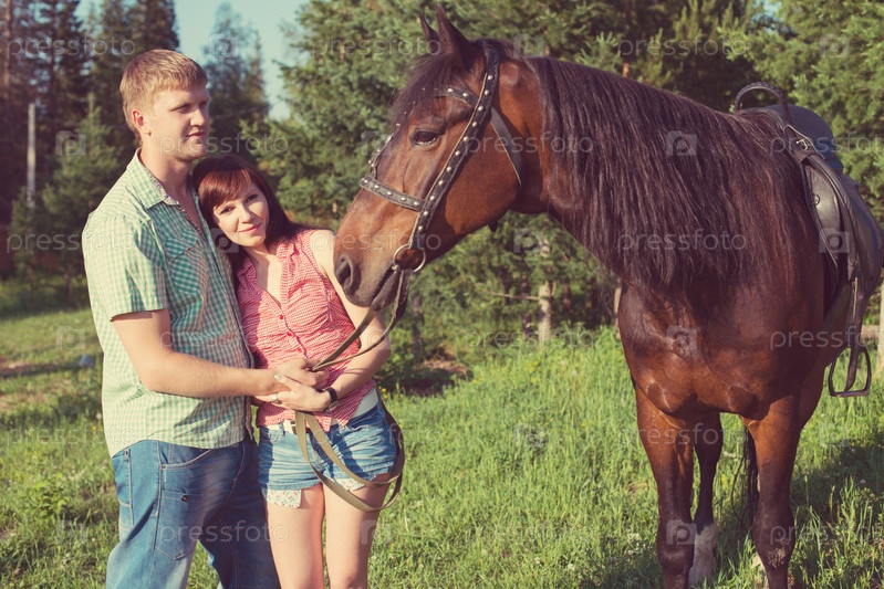 Счастливая пара с породистой коричневой лошадью на природе