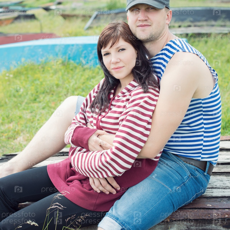 Молодая пара обнимается, сидя на рыбацкой лодке