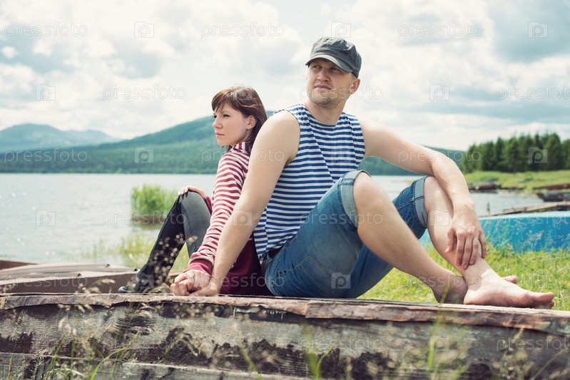 Молодая пара сидит на старой лодке на берегу горного озера