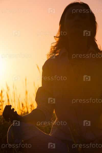 Красивая женщина занимается йогой, сидя на фоне восхода