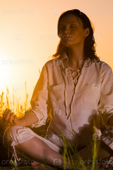 Красивая женщина занимается йогой, сидя на фоне восхода