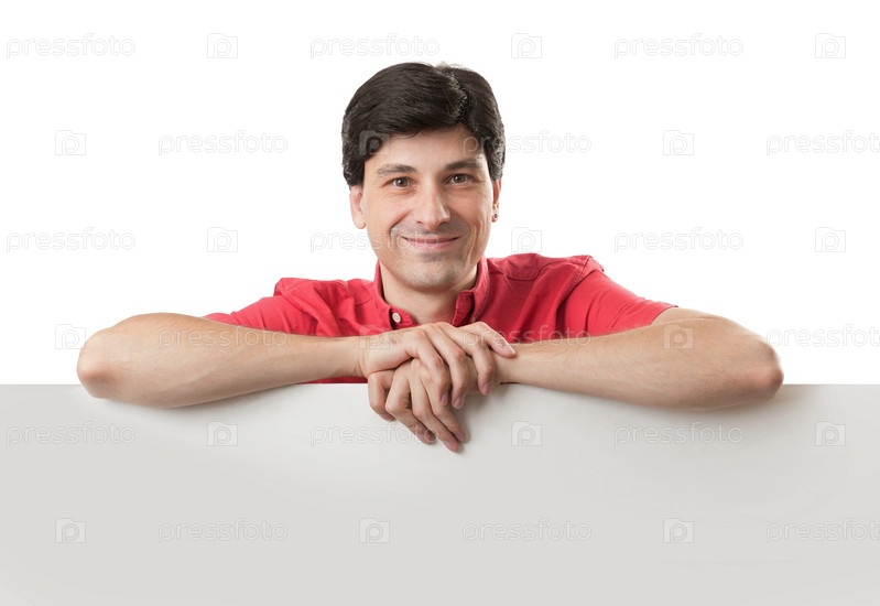 Счастливый молодой мужчина показывает на баннер для текста