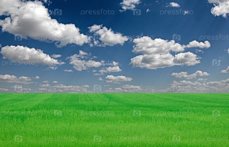 Поле зеленой травы и яркое голубое небо