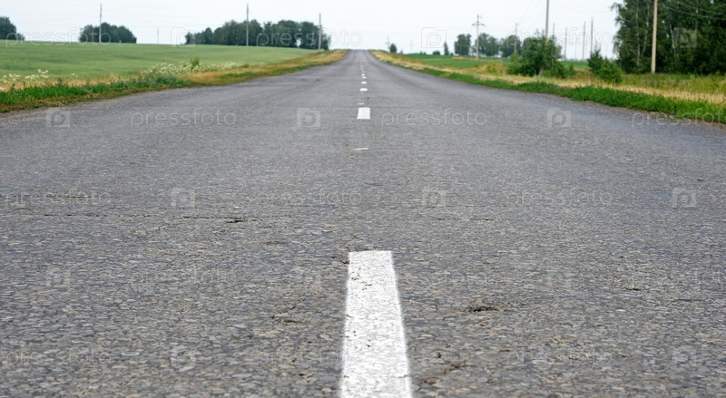 Асфальтовая дорога через зеленое поле и облака на голубом небе
