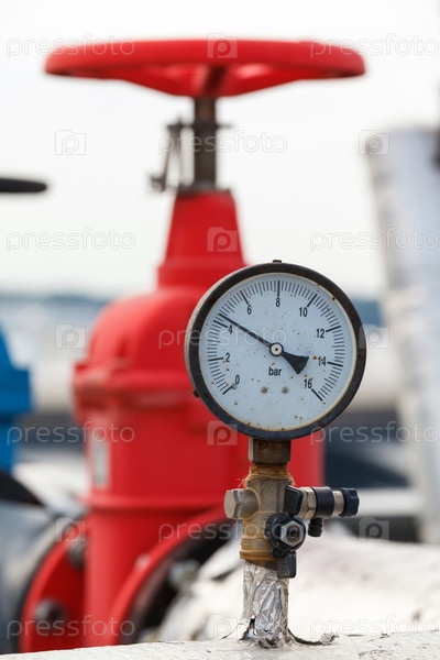 Манометр, красный клапан на горячей трубе
