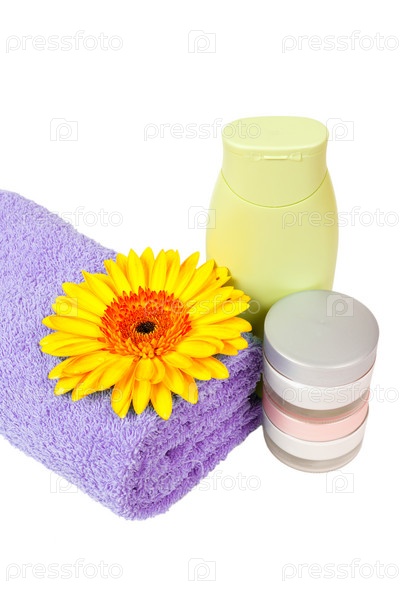 Сиреневое полотенце, крем, герберы
