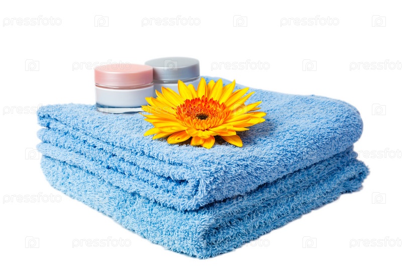 Синее полотенце, крем, герберы