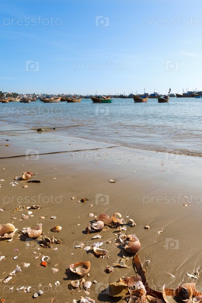 Раковины на песке и рыболовецкие лодки