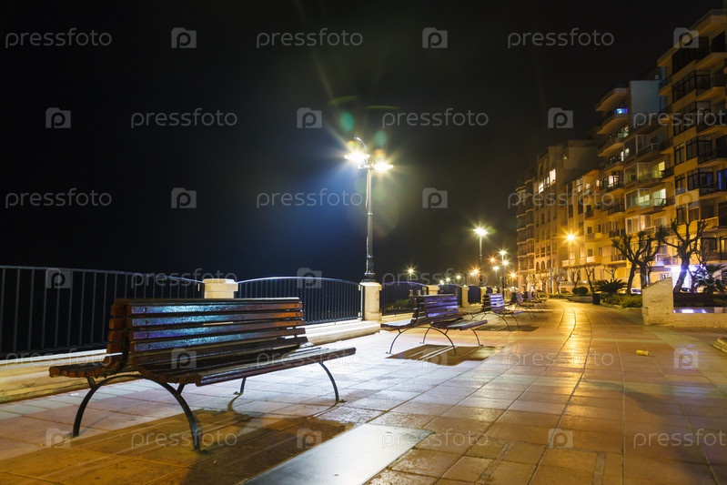 Ночной вид со скамьями и фонарем на Мальте