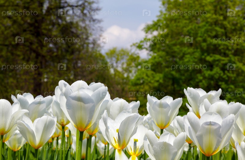 Поле красивых белых тюльпанов весной