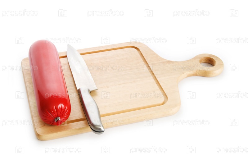 Колбаса, нож и доска для резки на белом фоне