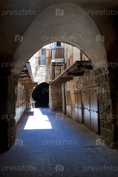 Старая улица саркой из песчаника и закрытые деревянные двери в центре города Сайда, Ливан
